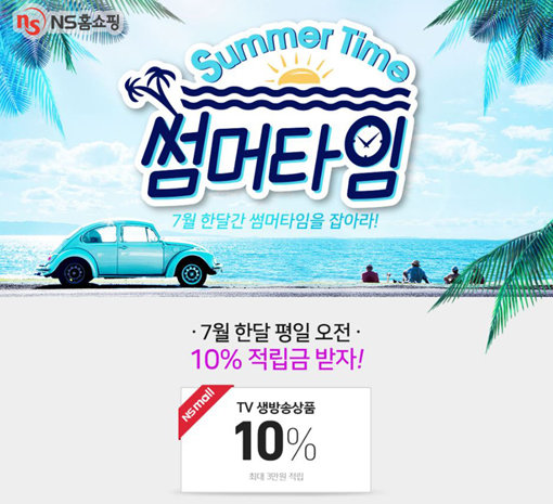 NS홈쇼핑이 7월 한 달간 ‘썸머타임 이벤트’(사진)를 진행한다. 평일에는 오전 9시에서 10시 사이에 방송하는 TV홈쇼핑 상품 구매자를 대상으로 10% 적립금을 준다. 1차(2∼13일), 2차(16∼31일)로 나눠 각 차수별 누적 적립금을 지급한다. 적립금은 차수당 최대 3만원까지 지급하며, 1차 적립금은 8월1일 적립해 8월30일까지 사용할 수 있다. 2차 적립금은 8월20일 적립해 9월18일까지 사용하면 된다.