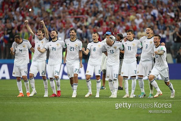 2018러시아월드컵 16강 러시아와 스페인과의 경기에서 승부차기 접전 끝에 8강에 오른 러시아 축구대표팀 선수들이 환호하고 있는 모습. 사진=게티이미지코리아