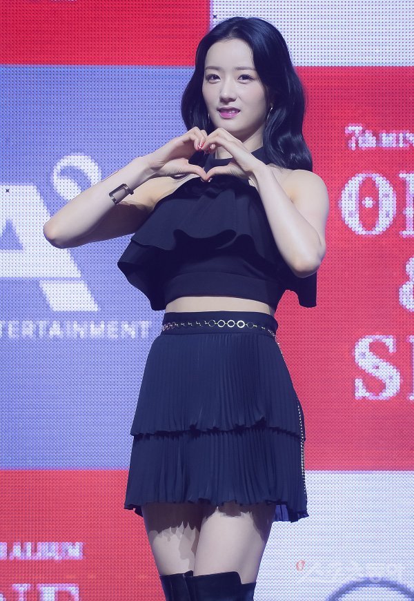 걸그룹 에이핑크 윤보미가 2일 서울 광진구 예스24 라이브홀에서 열린 일곱 번째 미니앨범 ‘ONE & SIX’ 발매 기념 쇼케이스에서 포즈를 취하고 있다.