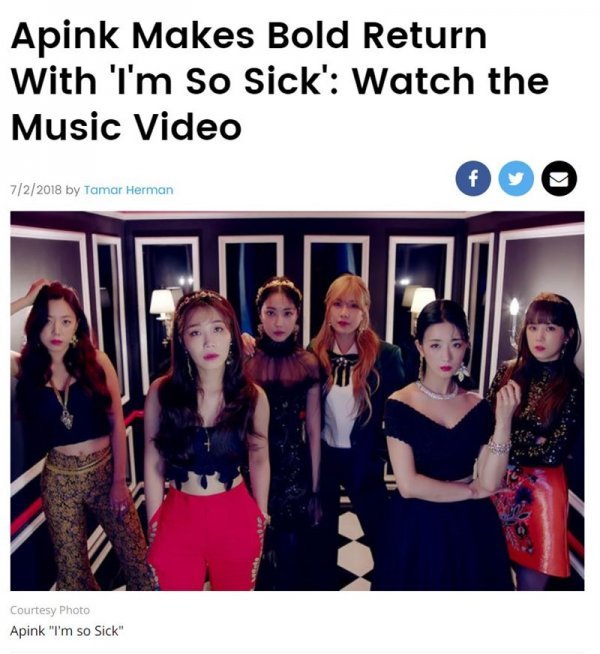 빌보드는 지난 2일(현지 시간) 공식 홈페이지를 통해 ‘에이핑크 ‘1도 없어(I’m So Sick)’로 대담한 귀환 (Apink Makes Bold Return With 'I'm So Sick: Watch the Music Video)’이라는 제목의 기사를 게재했다.