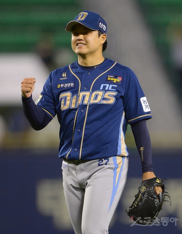 5일 서울 잠실야구장에서 열린 ‘2018 신한은행 MY CAR KBO리그’ NC다이노스와 LG트윈스 경기에서 NC가 5-3 역전승을 거뒀다. 경기 후 NC 마무리 장현석이 주먹을 불끈 쥐며 기뻐하고 있다.