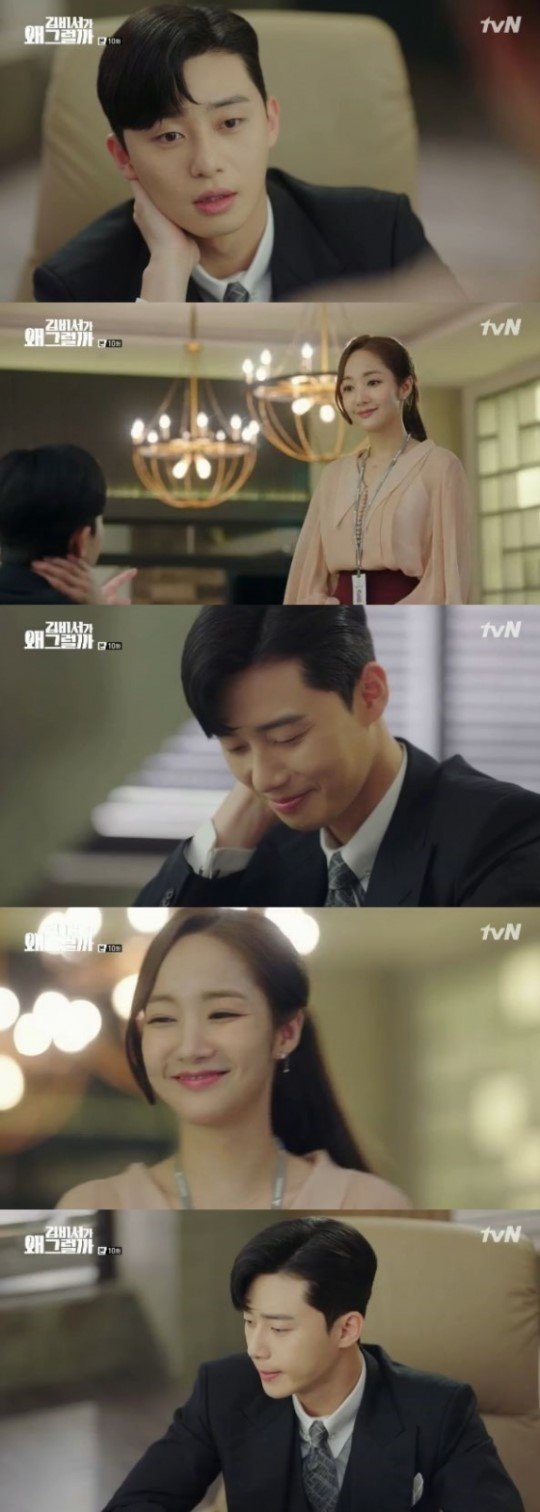 5일 오후 방송된 tvN 수목드라마 '김비서가 왜 그럴까'에서 김미소(박민영 분)와 이영준(박서준 분)이 대화하는 장면이 그려졌다.