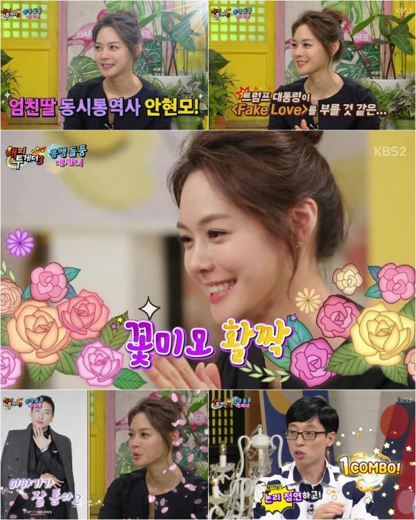 특히 안현모는 “방탄소년단의 노래가 나도 모르게 튀어 나온다”더니, “남편이 있으면 일부러 브랜뉴뮤직 메들리를 부른다”면서 팬심과 사랑 사이에서 줄타기를 하는 귀여운 면모로 시청자들의 배꼽을 강탈했다. 그런가 하면 안현모는 남편 라이머와의 첫 만남에 대해 “얘기가 잘 통하고 아버지와 같은 느낌이 들었다”며 열혈 방탄 팬에 이어 달달한 사랑꾼 면모를 보이며 안방극장에 깨소금 냄새를 솔솔 풍기기도 했다.