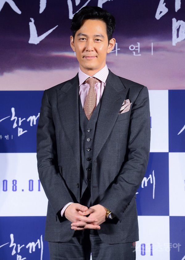 배우 이정재가 6일 서울 광진구 롯데시네마 건대입구에서 열린 영화 ‘신과함께 - 인과 연’ 제작보고회에 참석해 포즈를 취하고 있다.