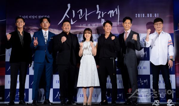 6일 서울 광진구 롯데시네마 건대입구에서 열린 영화 ‘신과함께 - 인과 연’ 제작보고회에 주연 배우들과 감독이 참석해 포즈를 취하고 있다. 왼쪽부터 배우 주지훈, 하정우, 마동석, 김향기, 김동욱, 이정재, 김용화 감독.