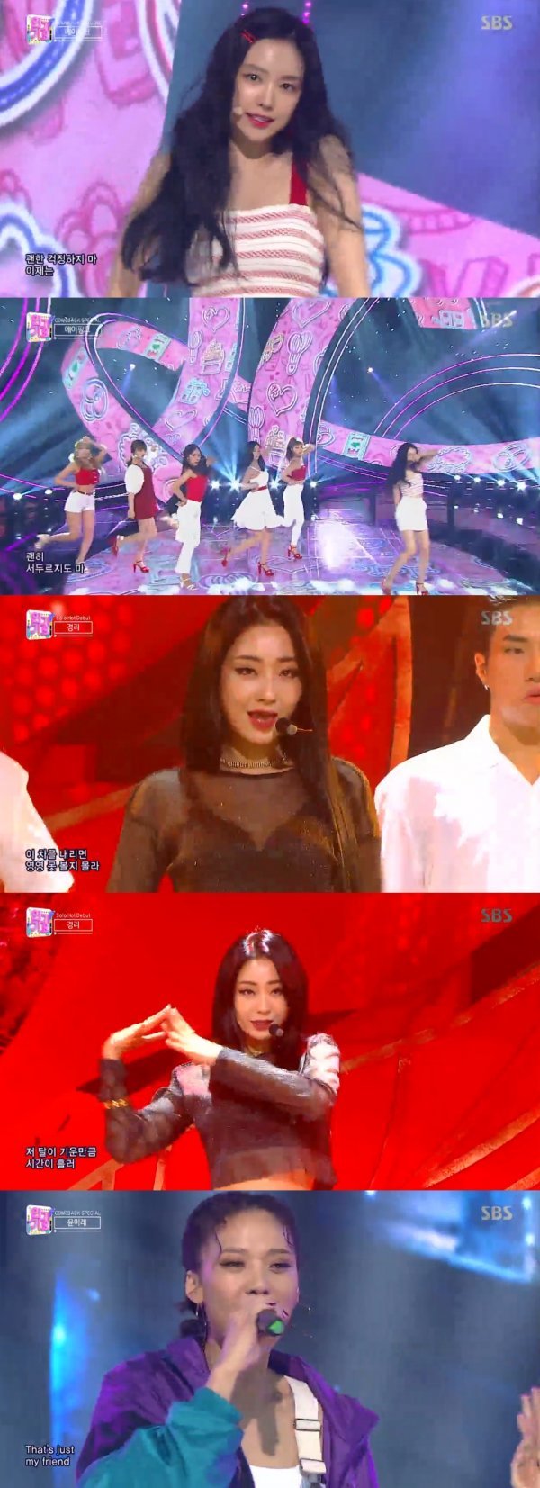 그룹 나인뮤지스 멤버의 경리도 데뷔 후 처음으로 솔로 싱글 ‘블루문’을 들고 귀환했다. 경리는 ‘인기가요’에서 연인과의 이별을 고하는 타이틀곡 ‘어젯밤’으로 몽환적인 무대를 꾸몄다.