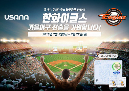 유사나헬스사이언스코리아는 ‘유사나와 함께 한화이글스 불꽃응원’ 이벤트를 22일까지 진행한다. 공식 SNS 계정을 팔로우한 뒤 댓글로 한화이글스 선수들에게 전하는 응원 메시지와 게시물 공유 URL을 남기면 된다. 경품으로 유사나 종합비타민 헬스팩을 비롯해 치킨 기프티콘, 커피 기프티콘 등이 증정된다. 유사나헬스사이언스코리아는 한화이글스 공식 후원사로서 종합비타민 헬스팩과 마그네칼D, 바이오메가 등의 건강기능식품을 2년 연속 제공하고 있다.