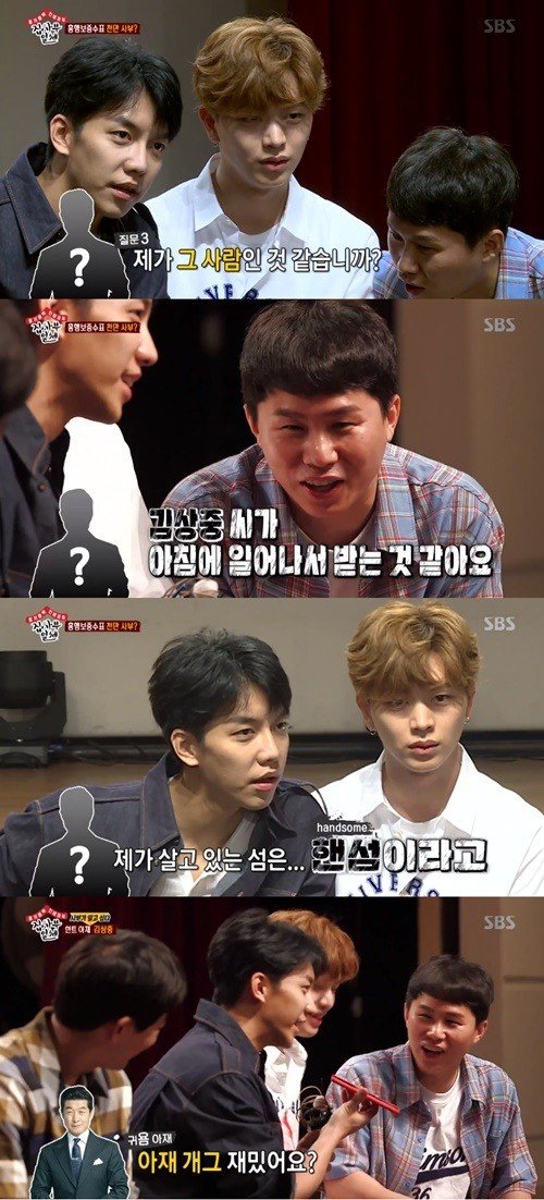 힌트를 주면서 김상중은 “나는 섬에 살고 있다. 한번도 와본 적 없을 것이다. 핸섬에 살고 있다”라며 아재 개그롤 선보였다. 이에 이승기는 “200% 김상중 선배님이 맞는 것 같다”라고 확신을 가져 웃음을 안겼다.