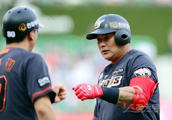 8일 인천 SK행복드림구장에서 ‘2018 신한은행 마이카 KBO리그’ SK 와이번스와 한화 이글스의 경기가 열렸다. 2회초 1사에서 한화 김태균이 안타를 치고난 뒤 고동진 코치의 환영을 받고 있다.