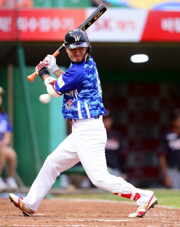 8일 인천 SK행복드림구장에서 ‘2018 신한은행 마이카 KBO리그’ SK 와이번스와 한화 이글스의 경기가 열렸다. 2회말 1사 1, 2루에서 SK 김성현이 한화 선발 김민우의 볼에 맞고 있다.