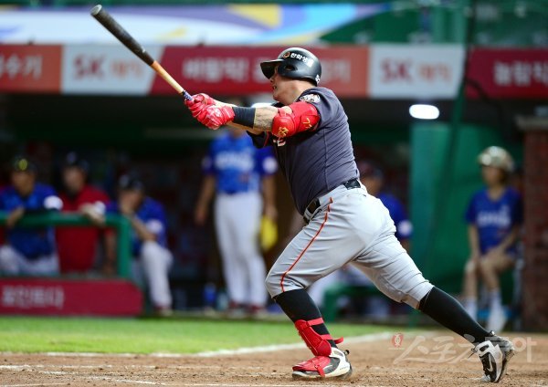 8일 인천 SK행복드림구장에서 ‘2018 신한은행 마이카 KBO리그’ SK 와이번스와 한화 이글스의 경기가 열렸다. 9회초 무사 2루에서 한화 김태균이 1타점 적시타를 날리고 있다. 김태균은 이날 안타로 개인통산 11번째 2000안타를 달성했다.