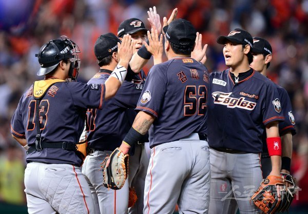 8일 인천 SK행복드림구장에서 ‘2018 신한은행 마이카 KBO리그’ SK 와이번스와 한화 이글스의 경기가 열렸다. 한화가 SK에 5-2로 승리한 뒤 선수들이 그라운드에서 기쁨을 나누고 있다.