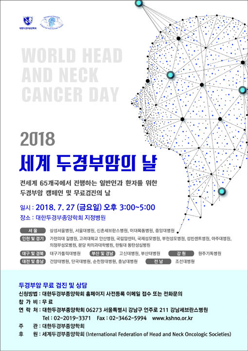 대한두경부종양학회에서는 7월27일 세계두경부암의 날을 맞아 전국 거점병원에서 두경부암 무료 검진 캠페인을 진행한다.