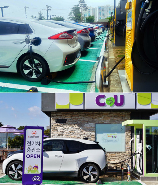 이마트 강릉점에 문을 연 집합형 초고속 전기차 충전소(위쪽)와 CU 제주도 점포에 설치한 전기차 충전소. 유통업계가 전기차 충전 인프라 확대에 적극 나섰다. 사진제공|이마트·CU