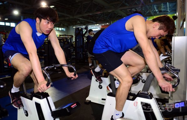 10일 충북 진천국가대표선수촌에서 ‘2018 자카르타팔렘방 아시안게임’을 앞두고 미디어데이가 열렸다. 남자 배구 대표팀 전광인과 김규민이 웨이트트레이닝을 하고 있다.