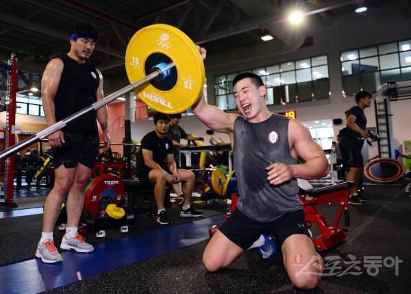10일 충북 진천국가대표선수촌에서 ‘2018 자카르타팔렘방 아시안게임’을 앞두고 미디어데이가 열렸다. 국가대표 선수들이 웨이트트레이닝을 하고 있다.
