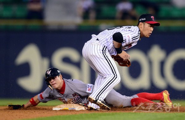 10일 서울 잠실야구장에서 ‘2018 신한은행 MY CAR KBO리그’ SK와이번스와 LG트윈스 경기가 열렸다. 3회초 2사 1,3루 상황에서 1루주자 SK 노수광이 2루 도루에 성공하고 있다.