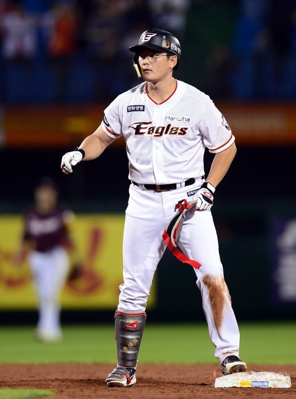 10일 대전 한화생명이글스파크에서 ‘2018 신한은행 마이카 KBO리그’ 한화 이글스와 넥센 히어로즈의 경기가 열렸다. 8회말 1사 2루에서 한화 이성열이 1타점 2루타를 날린 뒤 2루까지 진루하고 있다.