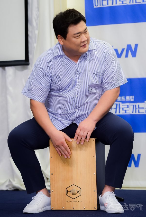 개그맨 김준현이 11일 서울 마포구 상암동 스탠포드호텔 서울에서 열린 tvN ‘이타카로 가는 길’ 제작발표회에서 카혼을 연주하고 있다.