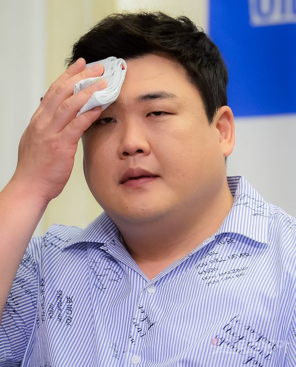 개그맨 김준현이 11일 서울 마포구 상암동 스탠포드호텔 서울에서 열린 tvN ‘이타카로 가는 길’ 제작발표회에서 손수건으로 땀을 닦고 있다.