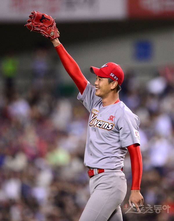 11일 서울 잠실야구장에서 ‘2018 신한은행 MY CAR KBO리그’ SK와이번스와 LG트윈스 경기가 열렸다. 6회말 1사 1,2루 LG 가르시아 좌전 안타 때 2루주자 김현수가 홈까지 달렸으나 아웃되자 SK 선발 김광현이 외야를 향해 손짓하고 있다.