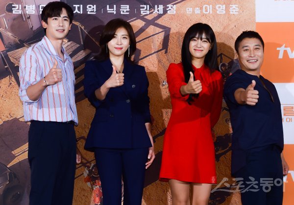 12일 서울 용산구 CGV 용산아이파크몰에서 열린 tvN ‘갈릴레오: 깨어난 우주’ 제작발표회에서 출연진들이 포즈를 취하고 있다. 왼쪽부터 2PM 닉쿤, 배우 하지원, 구구단 세정, 개그맨 김병만.