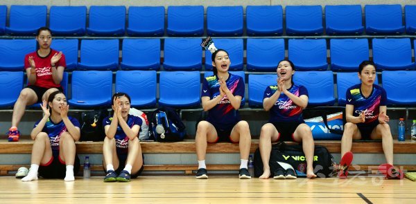 포천시청과 김천시청의 단체전 경기에서 김천시청 선수들이 박수를 치며 응원하고 있다.