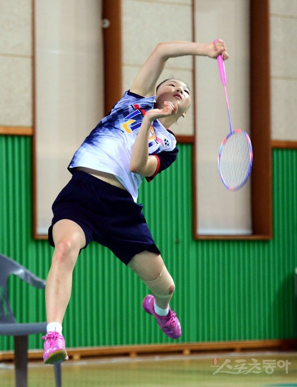 스포츠동아와 동아일보사가 주최하고 한국초등학교배드민턴연맹, 한국중고배드민턴연맹, 한국대학배드민턴연맹이 공동 주관하는 ‘이용대 올림픽 제패기념 2018 화순 전국 초·중·고·대학교 대항 배드민턴 선수권대회’가 15일 전라남도 화순 이용대 체육관에서 열렸다. 이다희(인천대)와 채희수(조선대)의 여자대학 단식 경기에서 이다희가 공격을 펼치고 있다.