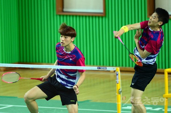 스포츠동아와 동아일보사가 주최하고 한국초등학교배드민턴연맹, 한국중고배드민턴연맹, 한국대학배드민턴연맹이 공동 주관하는 ‘이용대 올림픽 제패기념 2018 화순 전국 초·중·고·대학교 대항 배드민턴 선수권대회’가 15일 전라남도 화순 이용대 체육관에서 열렸다. 서강민-권용욱(대구가톨릭대)과 김용준-이상현(경희대)의 남자대학 복식 경기에서 서강민(오른쪽)이 공격을 펼치고 있다.