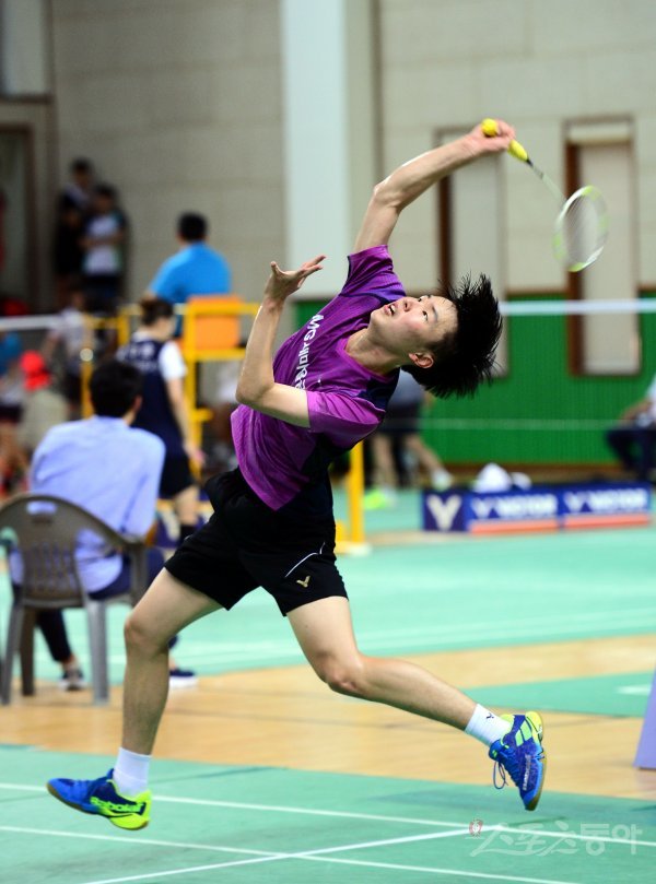스포츠동아와 동아일보사가 주최하고 한국초등학교배드민턴연맹, 한국중고배드민턴연맹, 한국대학배드민턴연맹이 공동 주관하는 ‘이용대 올림픽 제패기념 2018 화순 전국 초·중·고·대학교 대항 배드민턴 선수권대회’가 15일 전라남도 화순 이용대 체육관에서 열렸다. 변정수(백석대)와 김태완(대구가톨릭대)의 남자대학 단식 경기에서 변정수가 공격을 펼치고 있다.