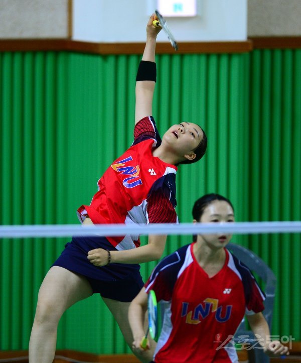 스포츠동아와 동아일보사가 주최하고 한국초등학교배드민턴연맹, 한국중고배드민턴연맹, 한국대학배드민턴연맹이 공동 주관하는 ‘이용대 올림픽 제패기념 2018 화순 전국 초·중·고·대학교 대항 배드민턴 선수권대회’가 15일 전라남도 화순 이용대 체육관에서 열렸다. 이다희-조영서(인천대)와 김민지-박지윤(군산대)의 여자대학 복식 경기에서 조영서(뒤)가 공격을 펼치고 있다.