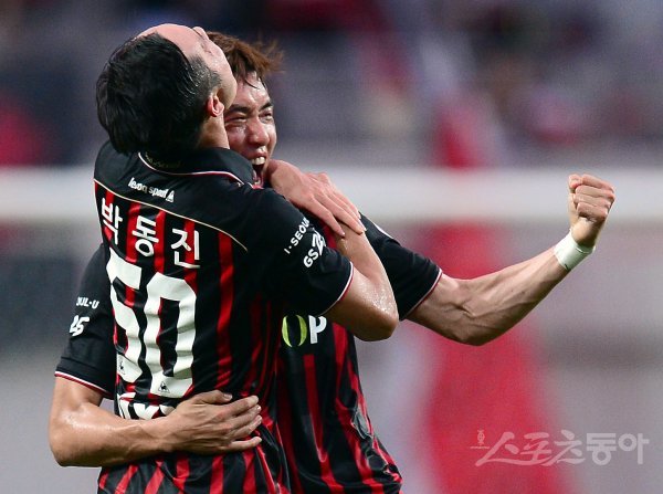 15일 서울월드컵경기장에서 열린 프로축구 ‘2018 KEB 하나은행 K리그1(클래식)’ 울산현대와 FC서울 경기에서 서울 윤석영이 프리킥 동점골을 성공시킨 후 박동진과 환호하고 있다.