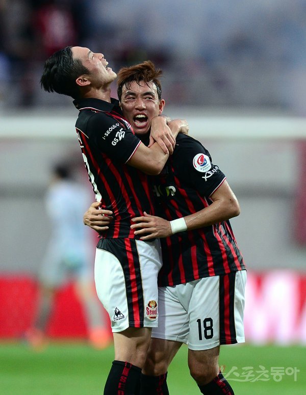 15일 서울월드컵경기장에서 열린 프로축구 ‘2018 KEB 하나은행 K리그1(클래식)’ 울산현대와 FC서울 경기에서 서울 윤석영이 프리킥 동점골을 성공시킨 후 박동진과 환호하고 있다.