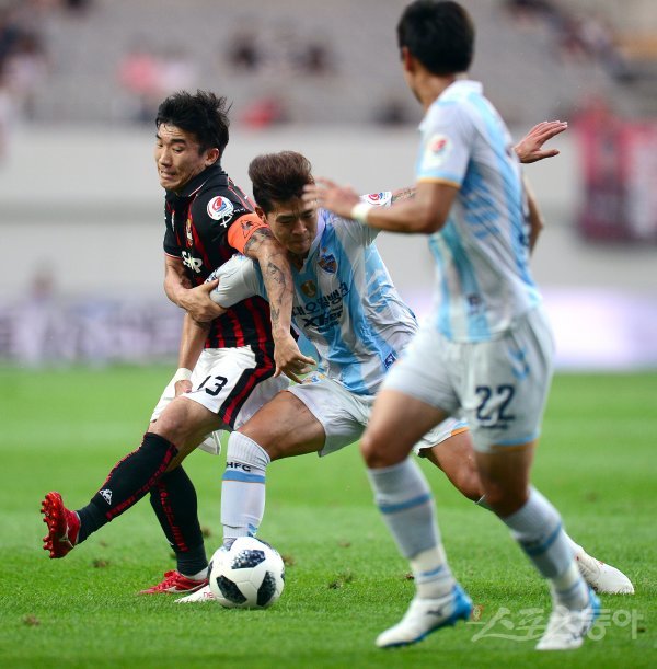 15일 서울월드컵경기장에서 열린 프로축구 ‘2018 KEB 하나은행 K리그1(클래식)’ 울산현대와 FC서울 경기에서 서울 고요한과 울산 김성주가 볼다툼을 벌이고 있다.