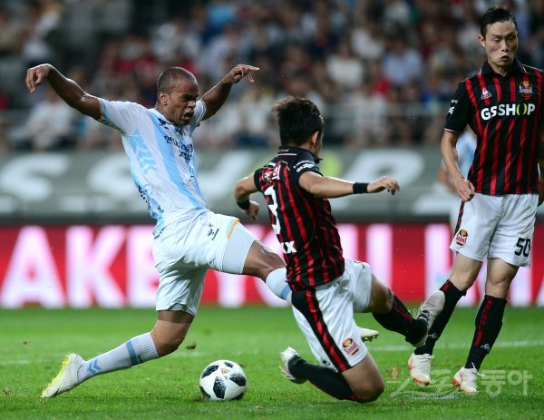 15일 서울월드컵경기장에서 열린 프로축구 ‘2018 KEB 하나은행 K리그1(클래식)’ 울산현대와 FC서울 경기에서 울산 주니오가 슛팅을 날렸으나 서울 수비에 막히고 있다.