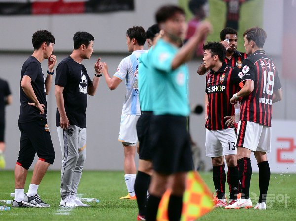 15일 서울월드컵경기장에서 열린 프로축구 ‘2018 KEB 하나은행 K리그1(클래식)’ 울산현대와 FC서울 경기에서 서울 이을용 감독이 고요한에게 작전 지시를 하고 있다.