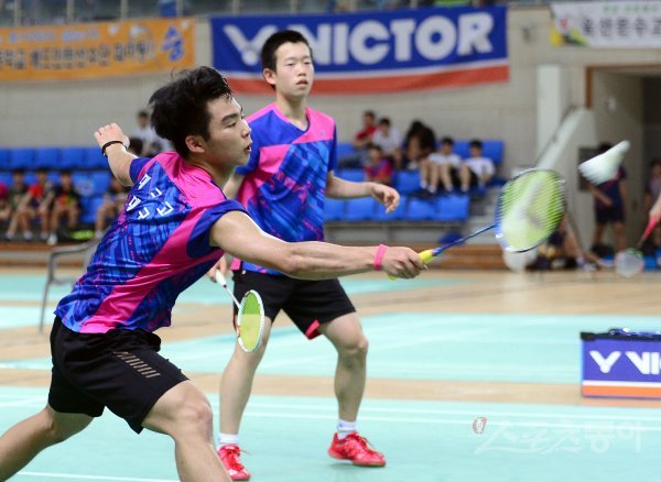 남자고등부 복식 예선에서 대구고 채지웅(왼쪽)-최민우 조가 리턴을 하고 있다.