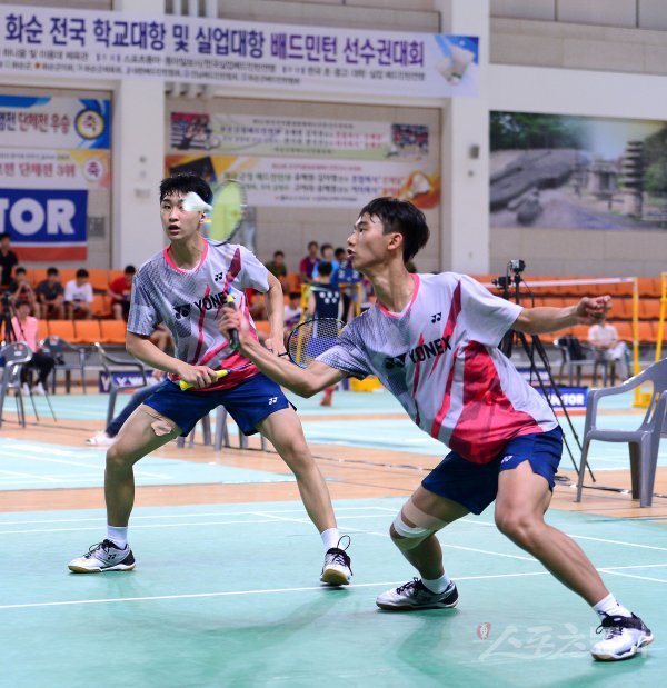 남자고등부 단체전 8강에서 전주생명과학고 장병찬(왼쪽)-김건국 조가 리턴을 하고 있다.