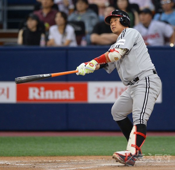 3회초 2사 LG 유강남이 넥센 선발 최원태를 상대로 투런 홈런을 치고 타구를 응시하고 있다.