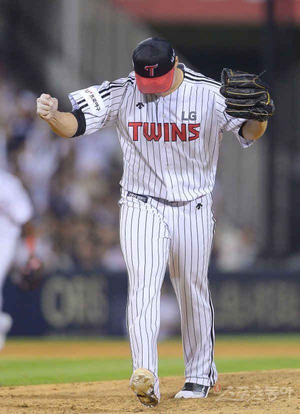 21일 서울 잠실야구장에서 ‘2018 신한은행 MY CAR KBO리그’ 두산베어스와 LG트윈스 경기가 열렸다. LG 선발 김대현이 2사 1,2루에서 두산 조수행을 삼진으로 처리한 후 기뻐하고 있다.