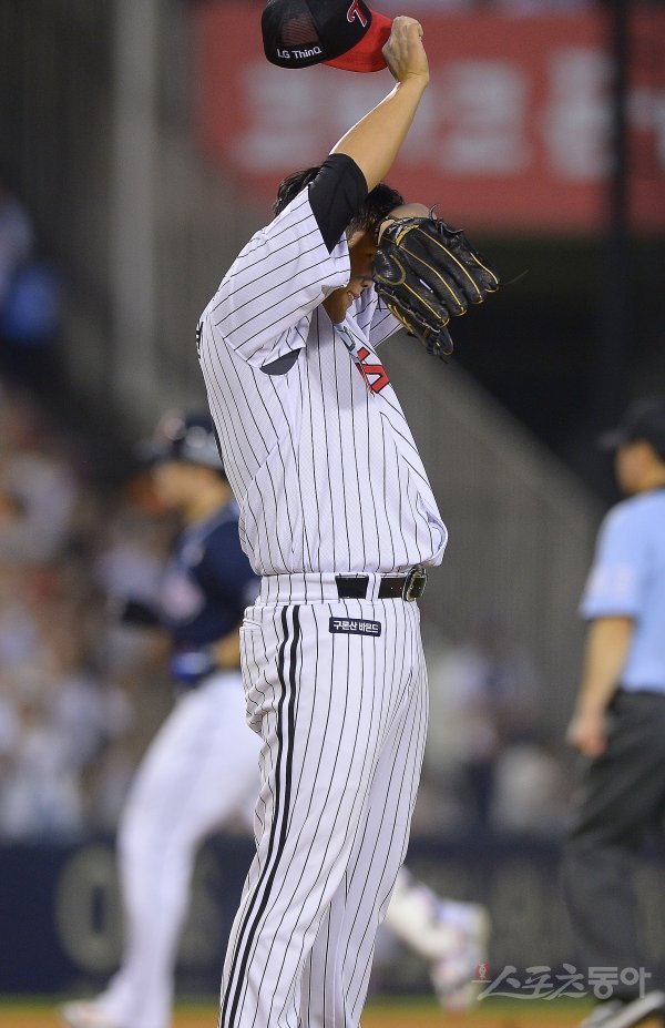 21일 서울 잠실야구장에서 ‘2018 신한은행 MY CAR KBO리그’ 두산베어스와 LG트윈스 경기가 열렸다. LG 선발 김대현이 6회초 선두타자로 나온 두산 김재환에게 솔로홈런을 허용한 후 아쉬워하고 있다.