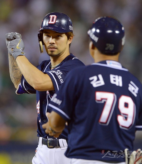 21일 서울 잠실야구장에서 ‘2018 신한은행 MY CAR KBO리그’ 두산베어스와 LG트윈스 경기가 열렸다. 7회초 선두타자로 나온 두산 오재원이 적시타를 친 후 세리머니를 하고 있다.