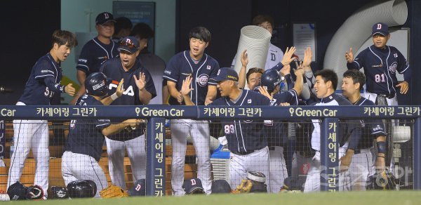 21일 서울 잠실야구장에서 ‘2018 신한은행 MY CAR KBO리그’ 두산베어스와 LG트윈스 경기가 열렸다. 7회초 2사 1,2루에서 두산 허경민의 역전 2타점 적시타 때 홈을 밟은 류지혁과 김재호가 더그아웃에서 동료들의 축하를 받고 있다.