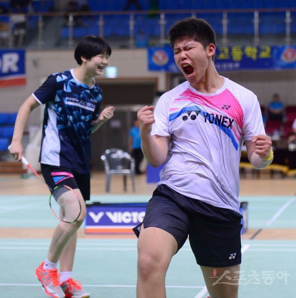 고등부 혼합복식 16강에서 박경빈(오른쪽)-최혜진이 세트스코어 2-0 역전승을 거두며 8강 진출을 확정지은 후 환호하고 있다.