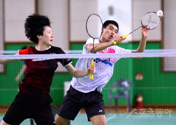 고등부 혼합복식 16강에서 나현철(오른쪽)-최예진 조가 스매싱 공격을 시도하고 있다.