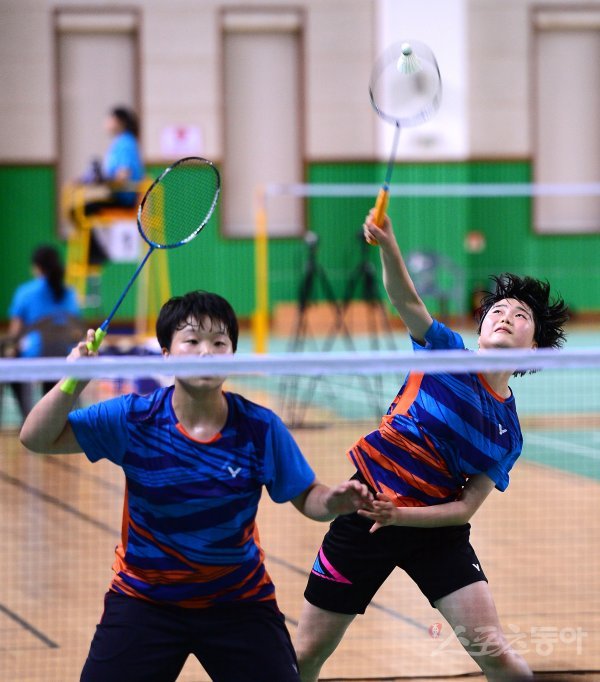 여자고등부 복식 16강에서 김천여고 정혜진-서유림(오른쪽) 조가 스매싱 공격을 하고 있다.