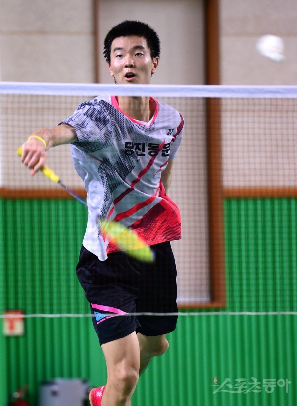 남자고등부 단식 16강에서 당진정보고 김성준이 스매싱을 하고 있다.