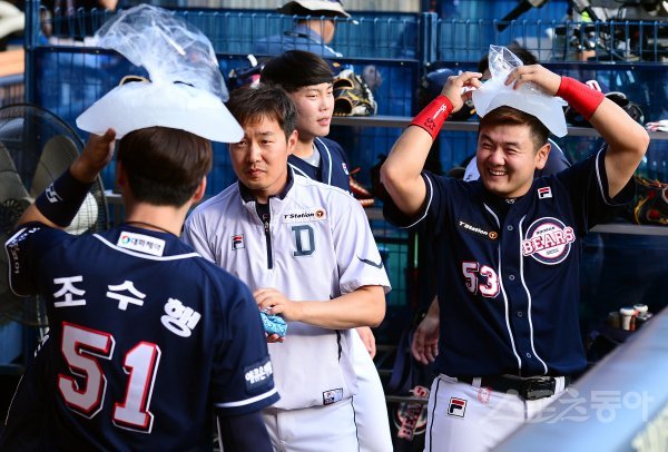 폭염특보가 내려진 가운데 두산 최주환이 얼음팩을 머리에 쓰고 있다.