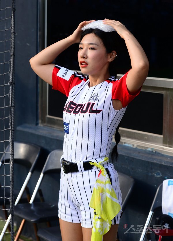 LG 배트걸이 무더위에 얼음팩을 머리에 쓰고 있다.