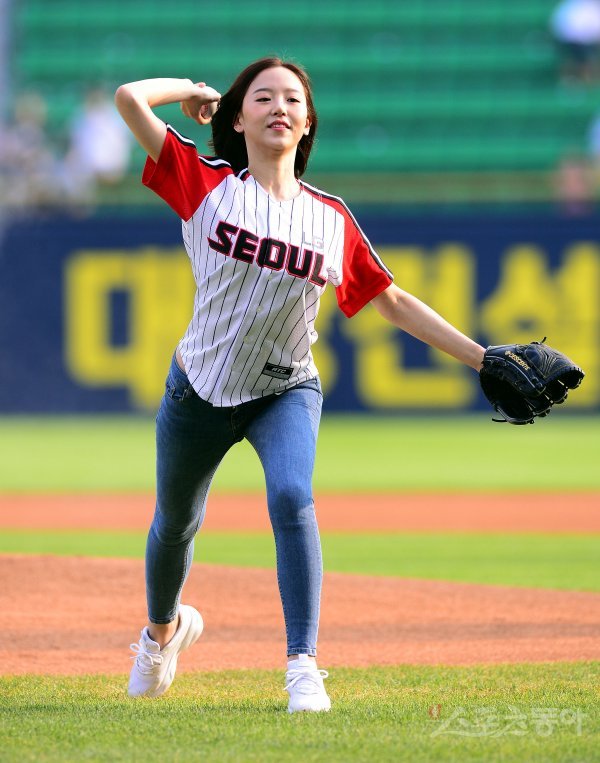 경기에 앞서 배우 강한나 시구를 던지고 있다.